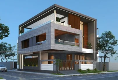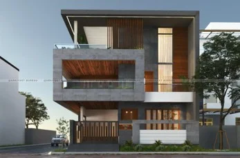 Modern house design in Lucknow by Arkitekt Bureau — a contemporary three-storey residence featuring sleek lines, elegant textures, and open terraces. This luxury home combines concrete, wood, and glass for a sophisticated architectural look that blends functionality, comfort, and timeless style.