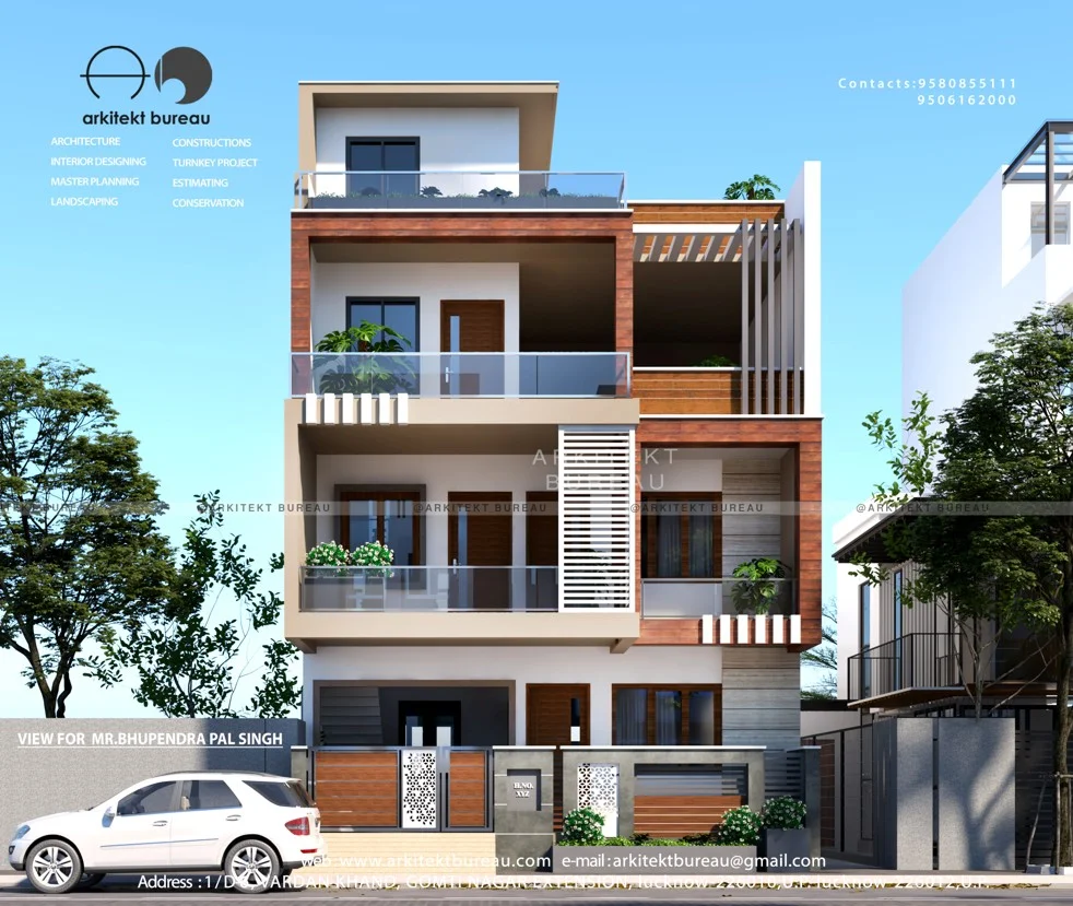 Modern three-storey residential building by Arkitekt Bureau. This contemporary home design showcases a sophisticated façade with warm wood, contrasting white elements, and strategic glass balconies. The detailed elevation includes stylish railings and a secure compound — ideal for luxury urban living.