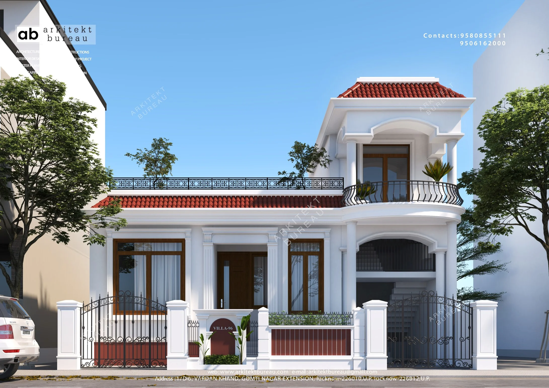 Classic single-story residential villa by Arkitekt Bureau, showcasing a charming facade with a striking red tiled roof, white columns, and wrought-iron balconies. This traditional home design features elegant architectural details and a refined compound gate, ideal for colonial-style villa elevation and sophisticated family living.
