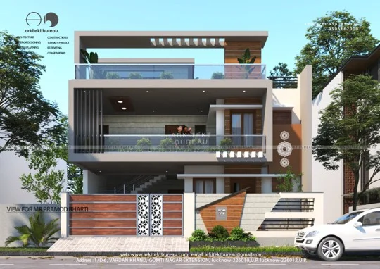 Modern house elevation in Lucknow by Arkitekt Bureau — a stylish two-storey residence showcasing clean lines, wooden textures, and open balconies. Designed for modern families, blending contemporary architecture with functional living spaces.