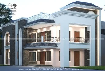 Luxurious two-story residential villa by Arkitekt Bureau, showcasing a grand facade with a blend of white, dark stone cladding, and classic black wrought-iron railings. This opulent home design features elegant balconies, arched windows, and a sophisticated material palette — ideal for traditional-contemporary villa elevation and expansive living.