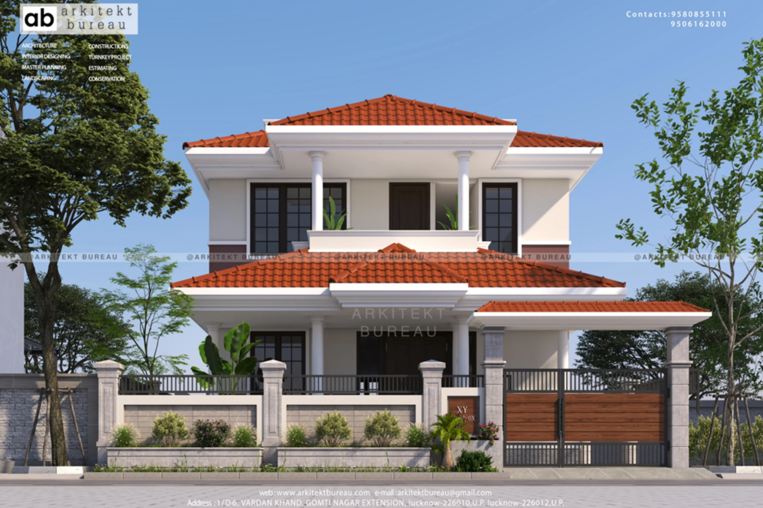 Traditional two-story residential villa by Arkitekt Bureau, showcasing a classic colonial facade with a vibrant red tile roof, white columns, and elegant balconies. This timeless home design features a substantial compound wall and a wooden gate, perfect for classic Indian bungalow elevation and elegant family living.