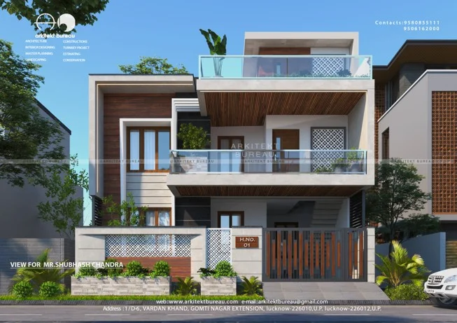 Luxurious two-storey modern villa featuring sleek wooden and stone facades, expansive glass balconies, and lush green landscaping — perfect for contemporary urban living. Custom-designed by Arkitekt Bureau for elegance and functionality.